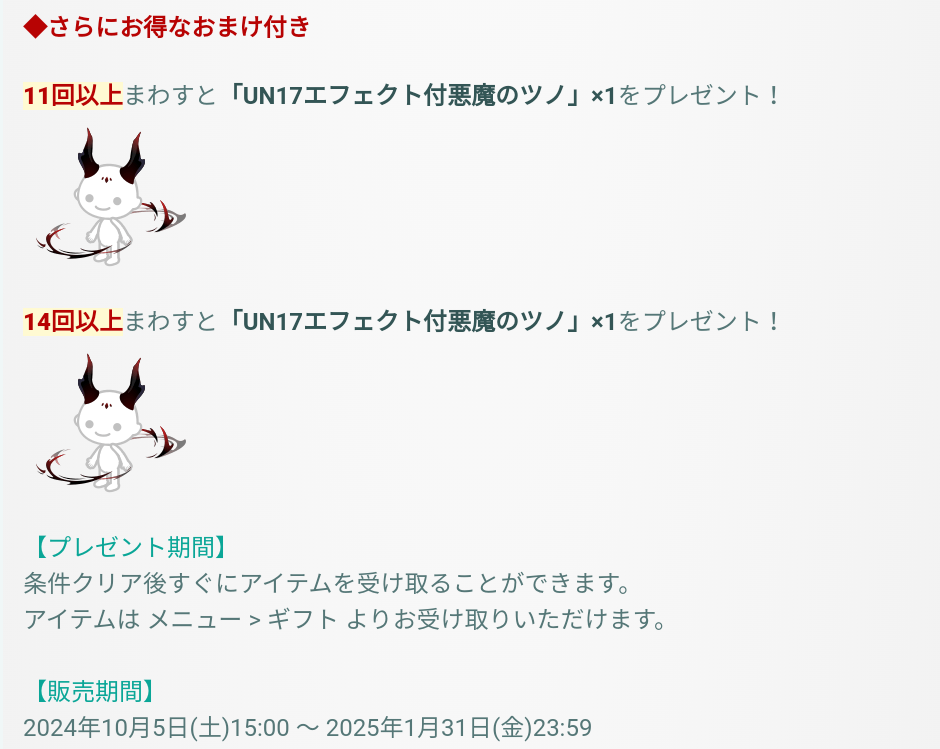 おまけ内容ではさらに鬼畜な設定として初回の連ガチャではもらえない11回(連ガチャは6連のため)と14回で貰えるけど