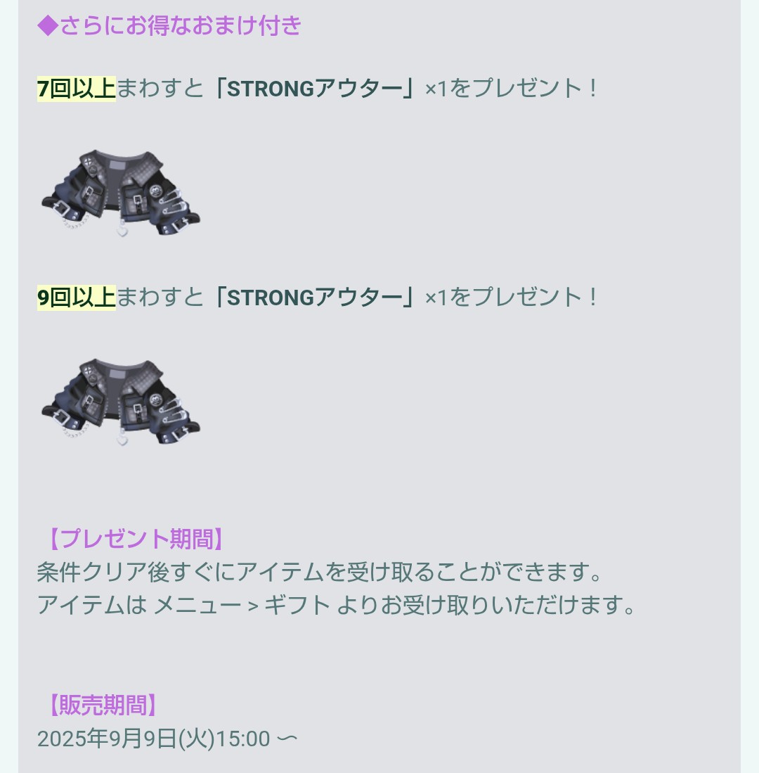 7回(連ガチャは6連のため)+9回にてアウターが貰えるんだけど〜