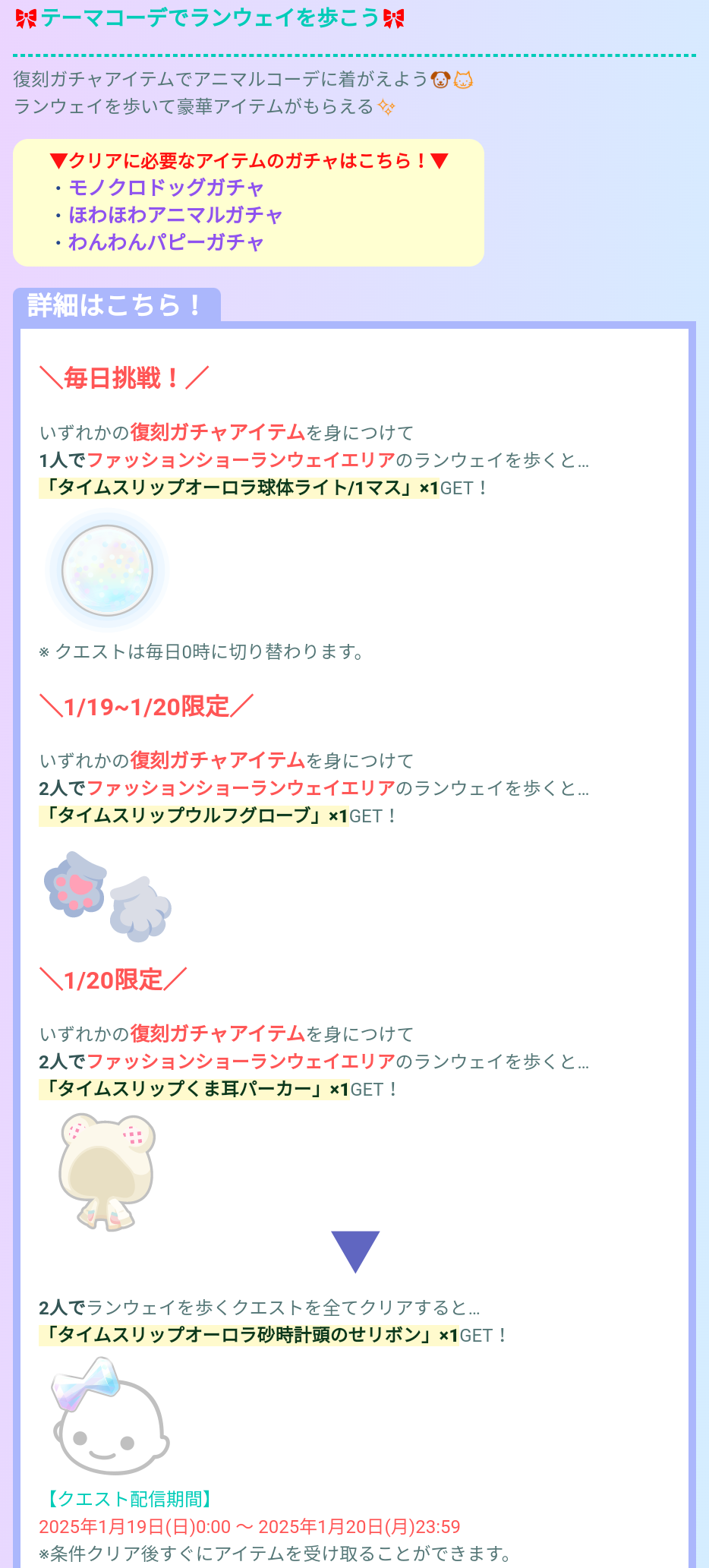 そして各日程別で同じく復刻ガチャアバターを身に着けランウェイを1人or2人で歩くことで限定アバターが貰える仕様となっています。