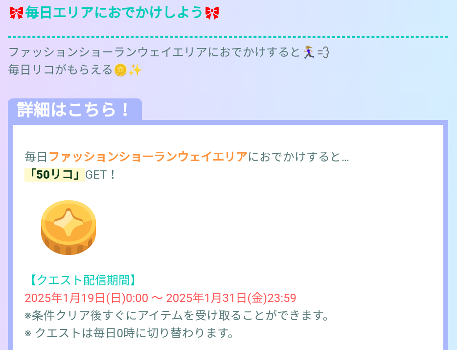 デイリークエストではファッションランウェイエリアにおでかけすることで毎日50リコが貰え、