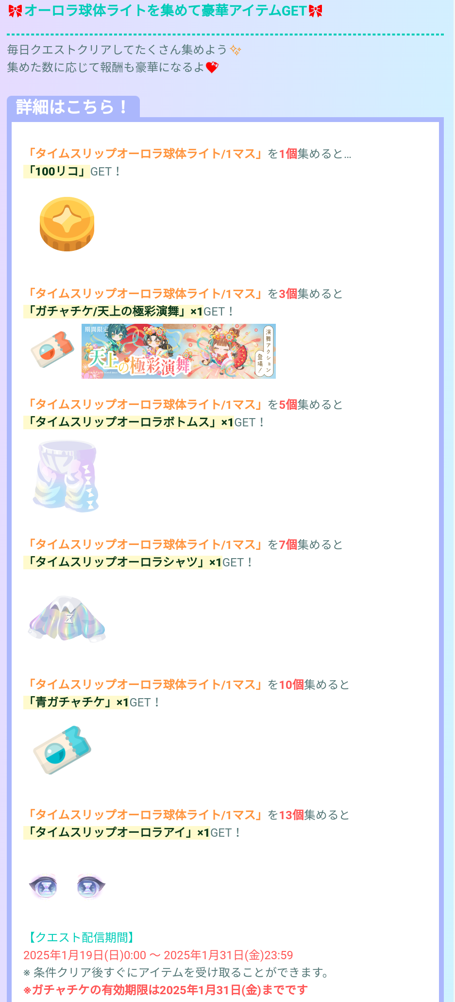 上記でのオーロラ球体ライトを規定個数集めることで無料リコやガチャチケ