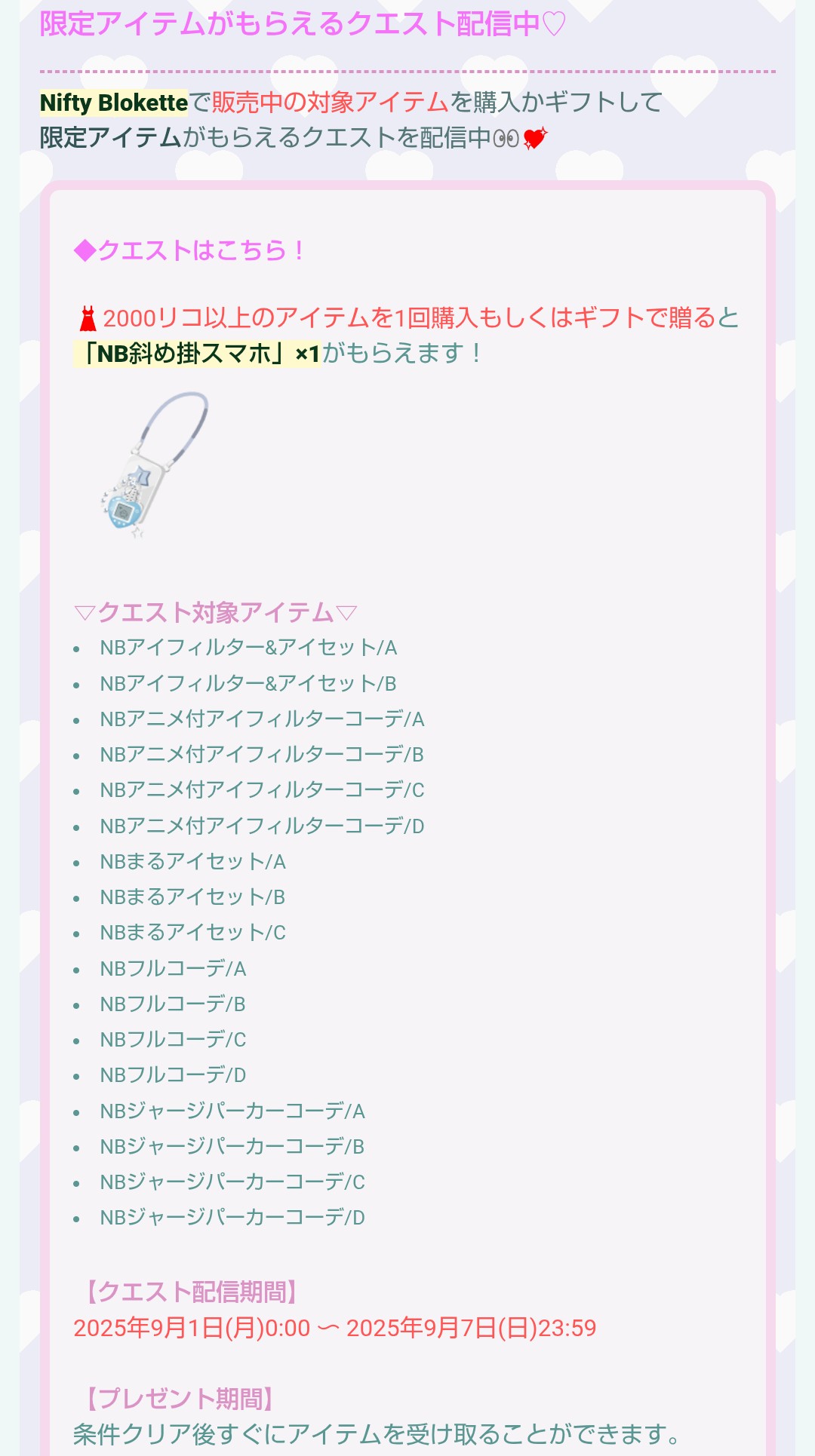 2,000リコ以上のアイテム(コーデしかないけどw)を1回購入することでGETできる仕様となっています….〆(・ω・*)メモメモ