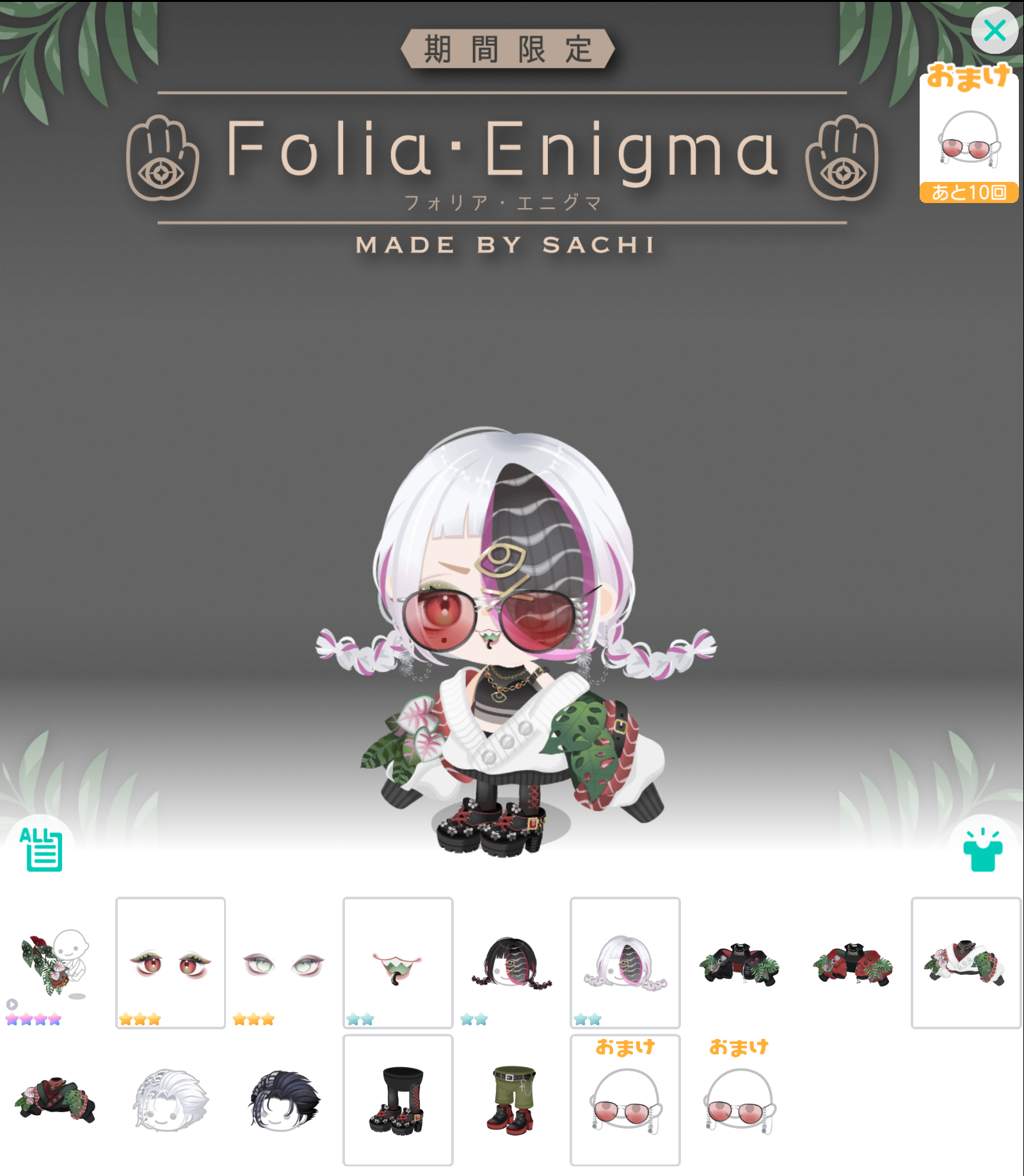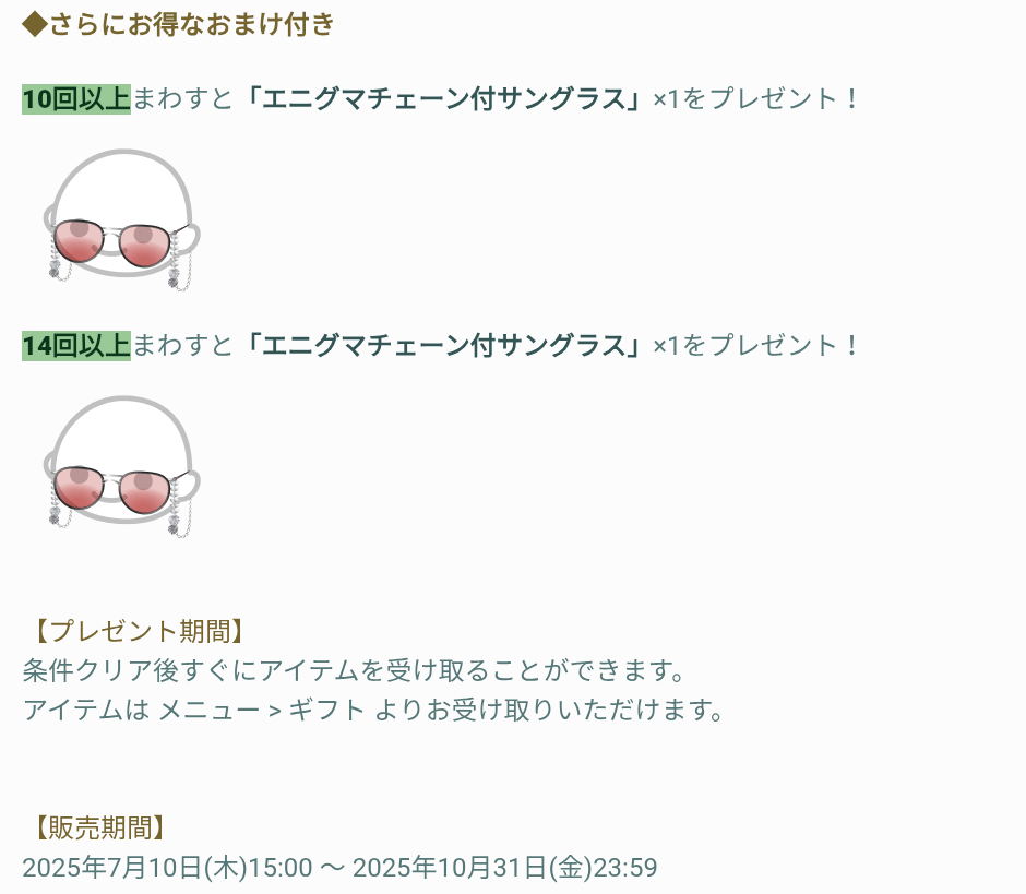 おまけ内容ではエニグマのチェーン(?)がついたサングラスが初回の連ガチャでは貰えない
