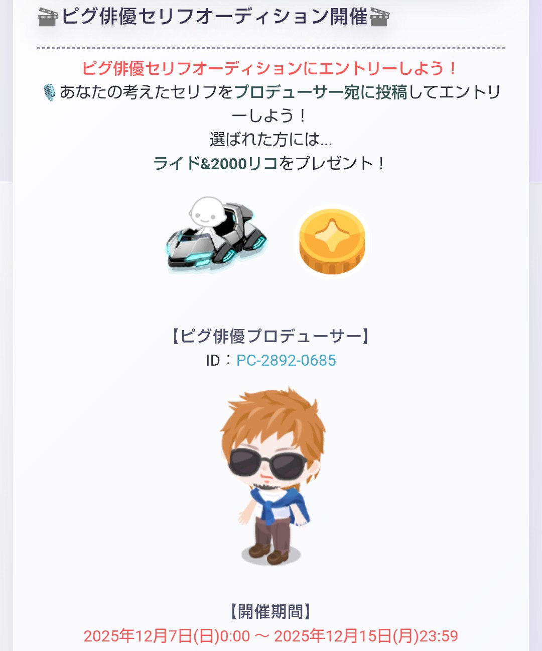 グランプリの当選者にはすいすいライドと2000リコがもらえる内容となっています。