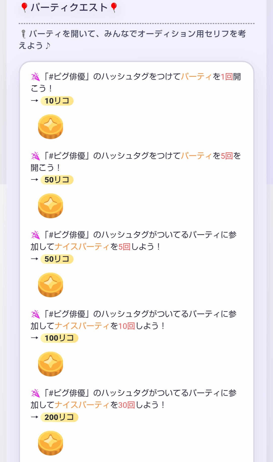 ナイスパーティを規定回数行う事でリコやチケットが手に入るようです。