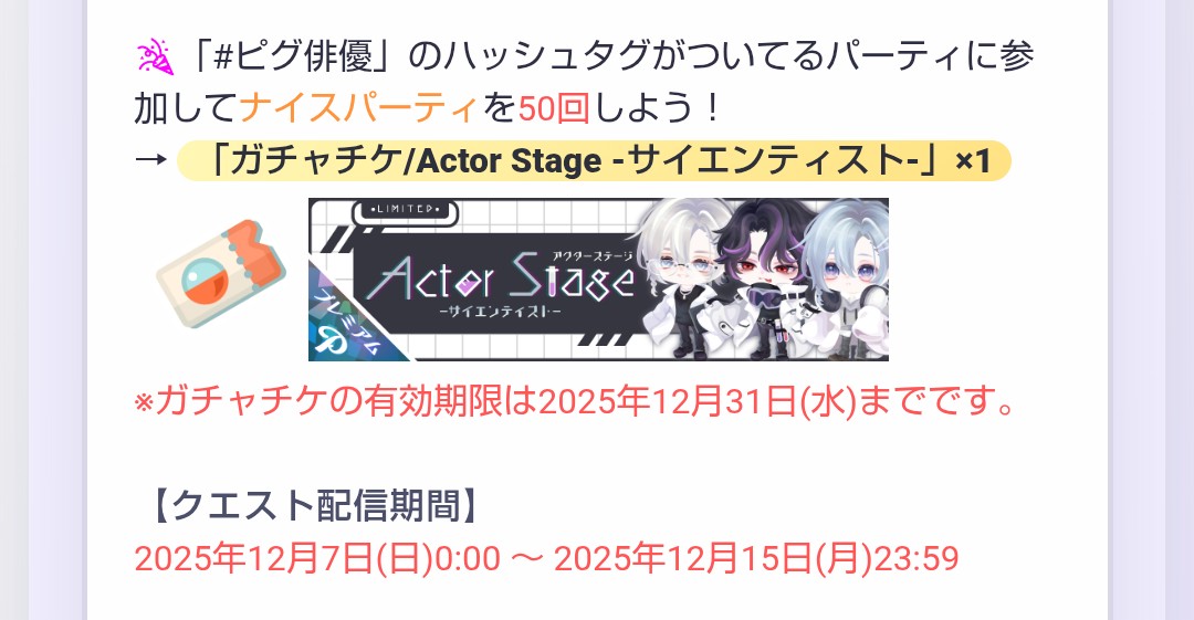 【アクターステージ】が回せるガチャチケが貰えるクエストとなっていて、