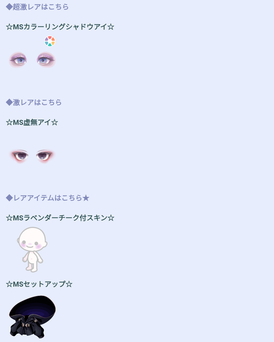 チーク付のスキンチェンジアバターとフード付きのセットアップアバターとちょっとレアとしての少なさで