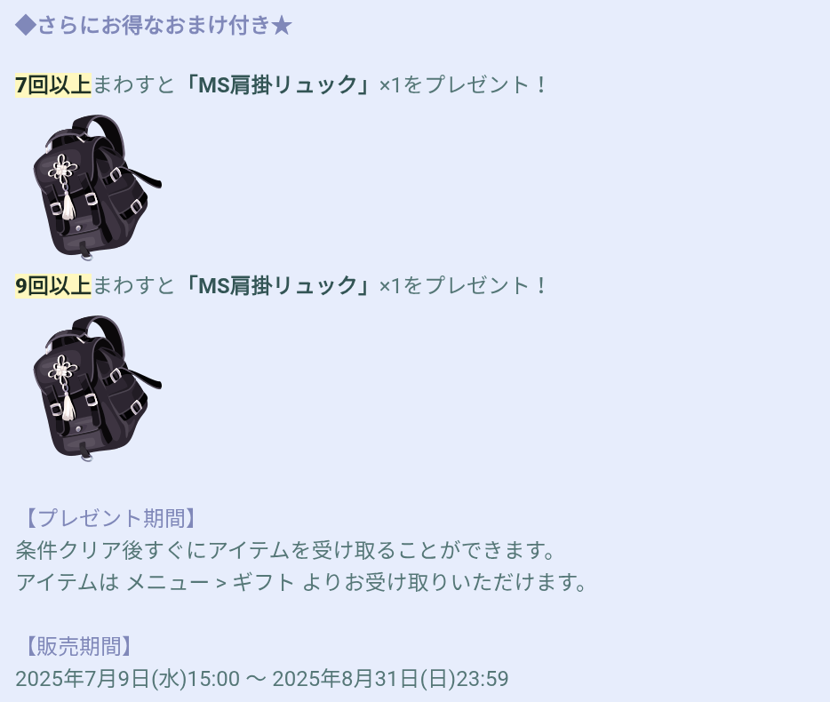 おまけ内容では初回の連ガチャではあと1回足りないシリーズの7回(連ガチャは6連のため)+9回にて
