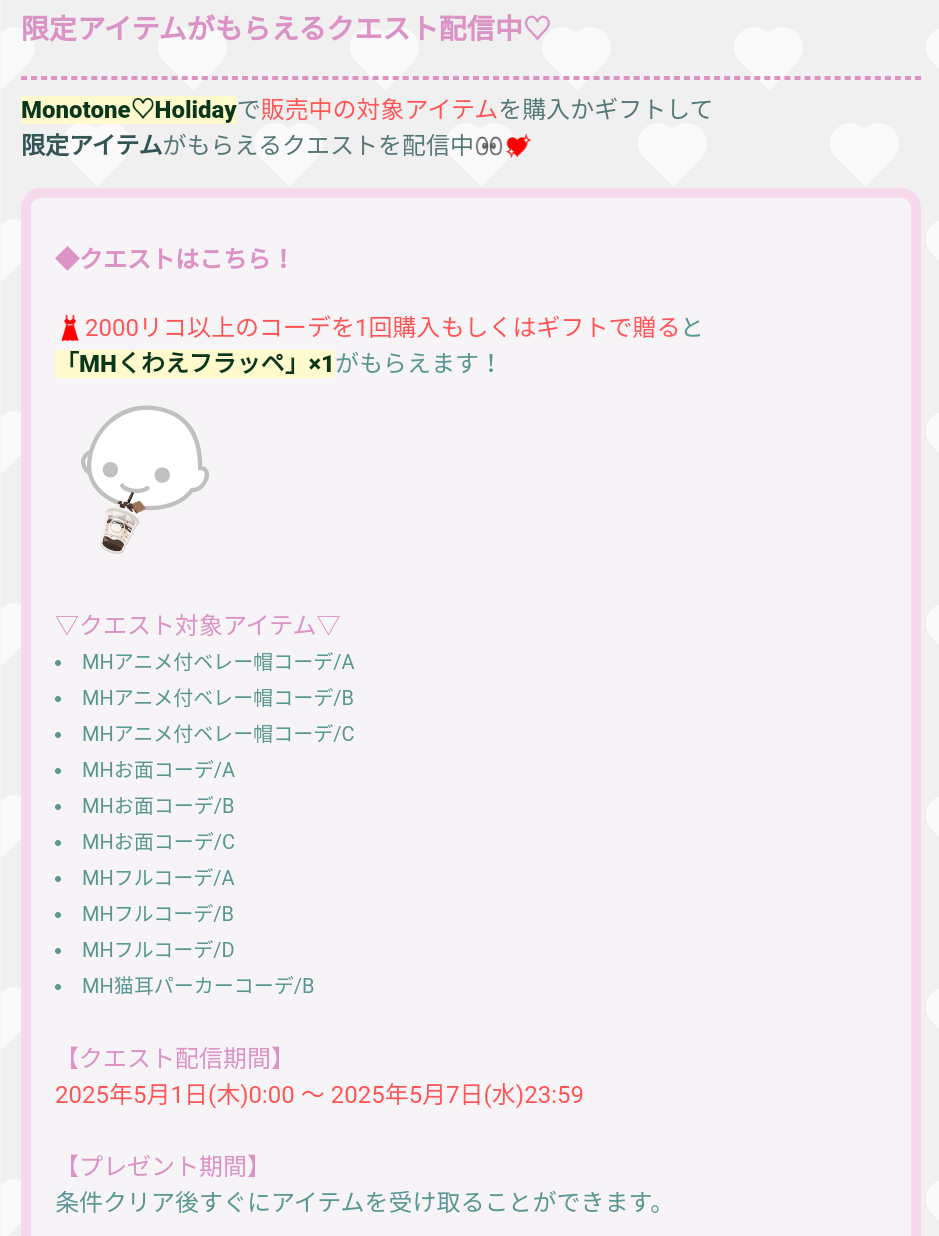 ギフトクエストでは2,000リコ以上のコーデを1回購入orギフトにて