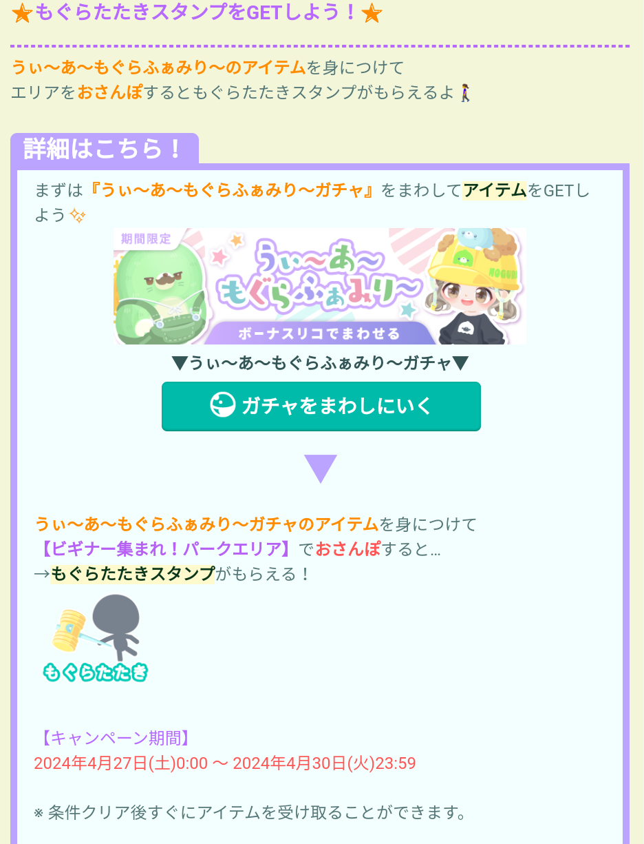 GET条件は至って簡単で~『うぃーあーもぐらふぁみりーガチャを1回回してそれを身に着けてビギナー集まれパークでおさんぽする』となっているので記事後半での有料無料選択ガチャを回してアバターを1個GETしましょう(-_-)/~~~ピシー!ピシー!