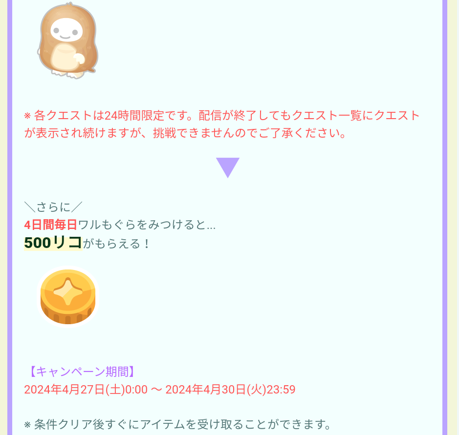 しれっと4日間しか期間がなく一日でも逃すとコンプリートクエストはクリアできないので明日やればいいやwは通用しなくなるので要注意です(´◉◞౪◟◉)b~☆