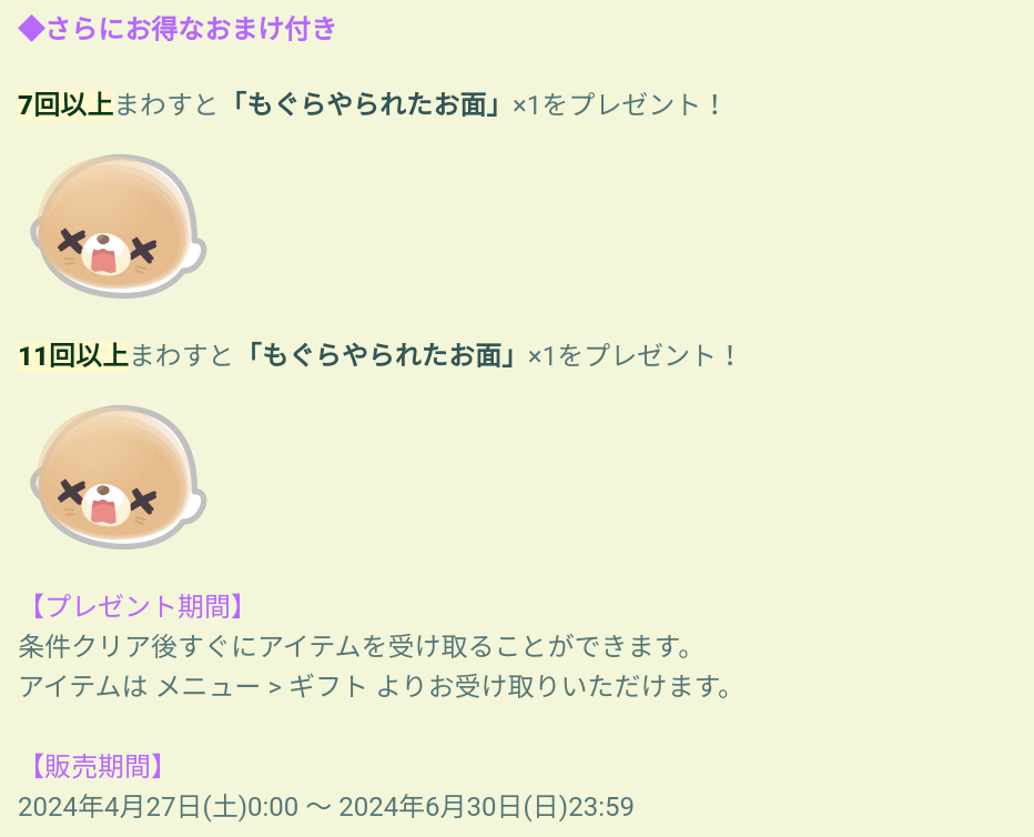 おまけ内容では初回の連ガチャでは貰えない7回(連ガチャは有料も無料も6連のため)となっていて、最近クオリティが上がりつつあるおめんをもらうにはそんだけ回さないといけないのでここで足元見らている感がパない回数設定でサービスが悪いなぁって思いますね( ゚д゚)タシカニ