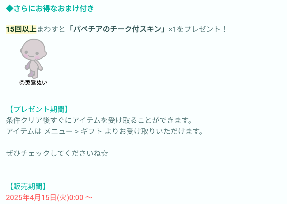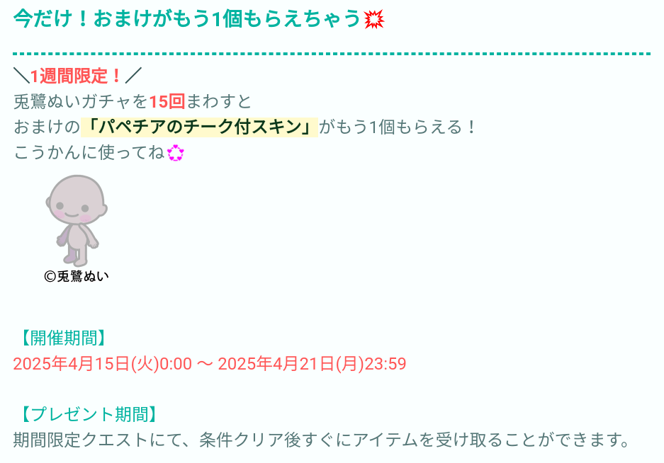 パぺチアというキャラを再現するチーク付きのスキンチェンジアバターが貰えるんだけど~