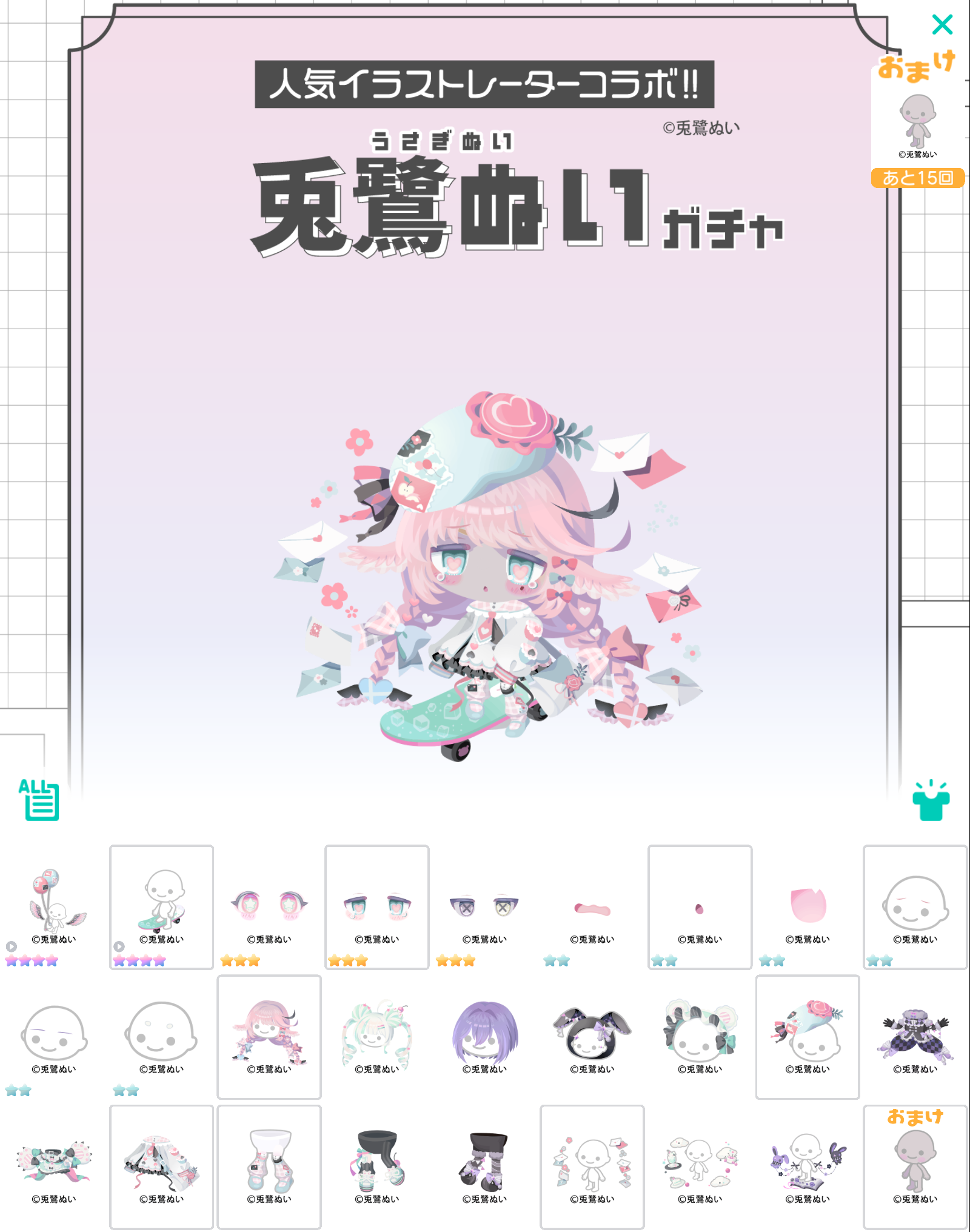 こちらではイラストレーターの兎鷺ぬいとのコラボより有料ガチャとして