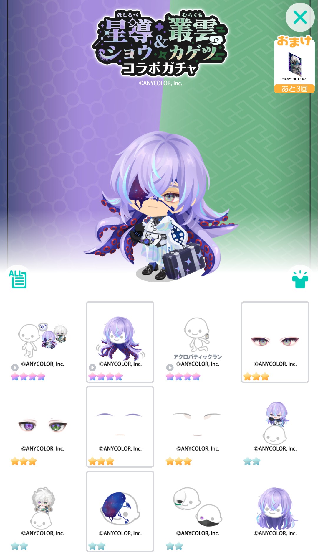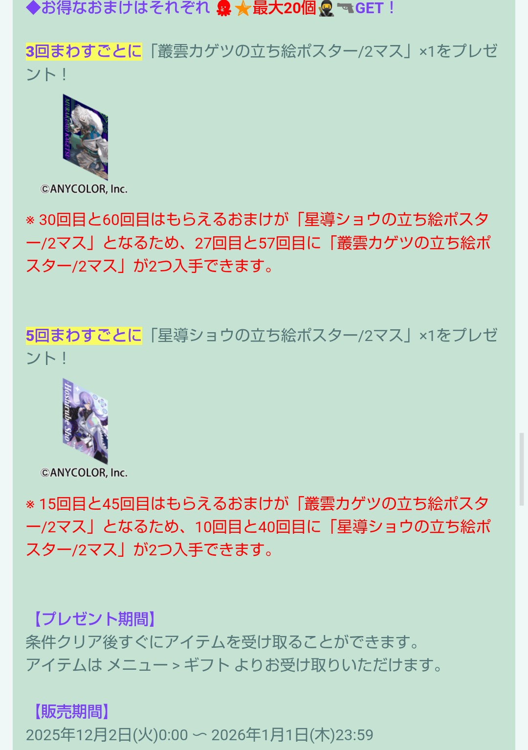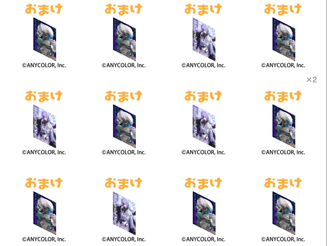 おまけ内容で3回ごとに叢雲カゲツ、5回ごとに星導ショウのポスターが交互にもらえ