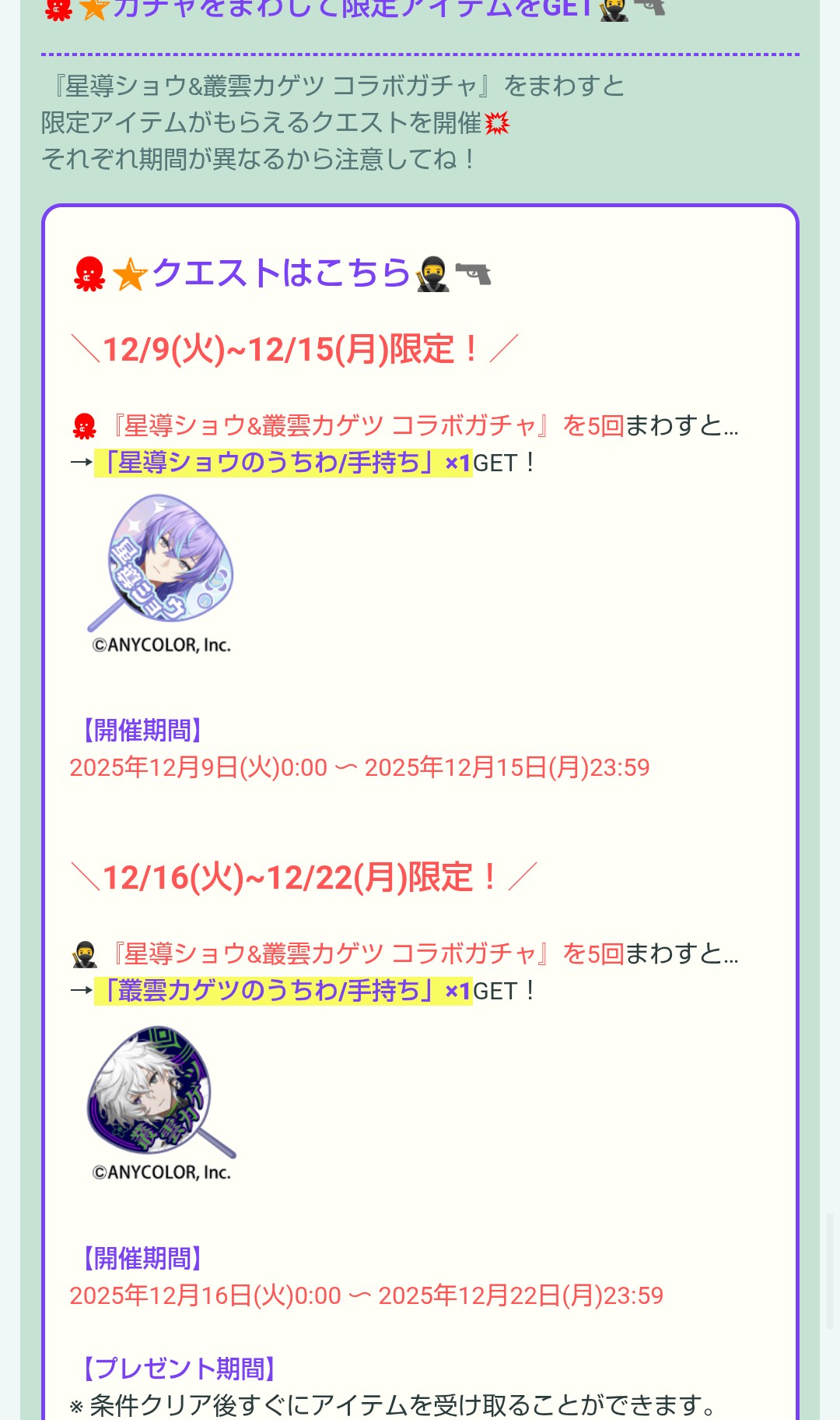 こちらでは12/9〜15、12/16〜22日の2つの期間にて5回ずつガチャを回すことで