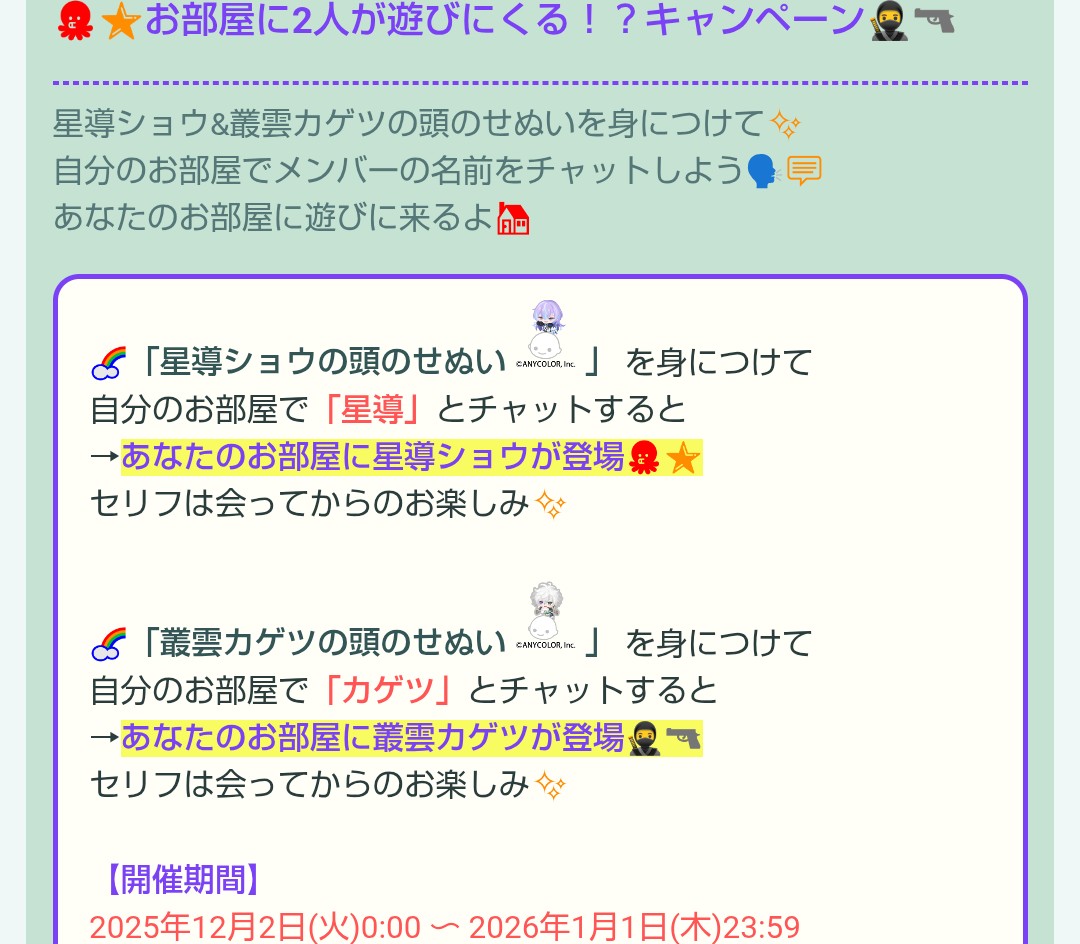 それぞれ星導ショウや叢雲カゲツがお部屋にやってきてセリフを言ってくれるらしいですw