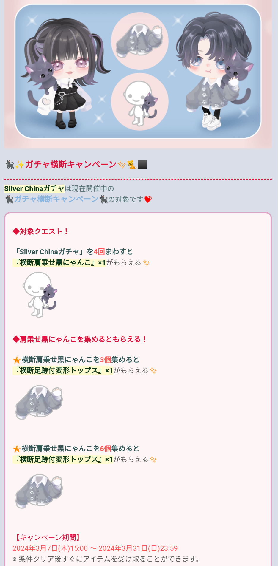 横断キャンペーン内容ではどうやら肩乗せ黒にゃんこが貰える回数が4回で固定されているので連ガチャが4連以上のガチャならお得に貰えるっていう点は〇だと思うんだけど~常に出てくる対象ガチャを1回でも連ガチャ回せる課金者限定になるキャンペーンなのでぶっちゃけお得に思いにくい内容に思うんだけど実際のところ課金者ユーザーの方々の感想ってどうなんでしょう?( ゚д゚)ソレナ