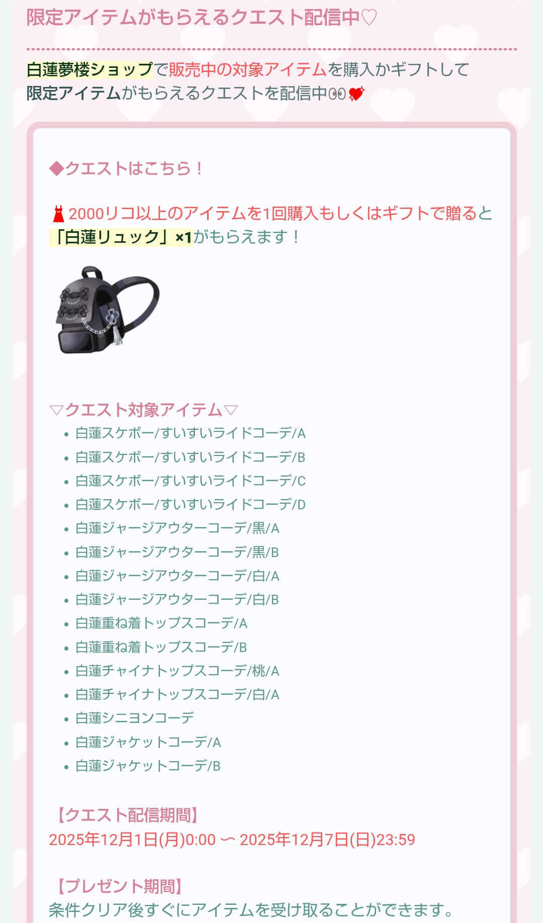 ギフトクエストでは2,000リコ以上のセットアップコーデを1着購入することで