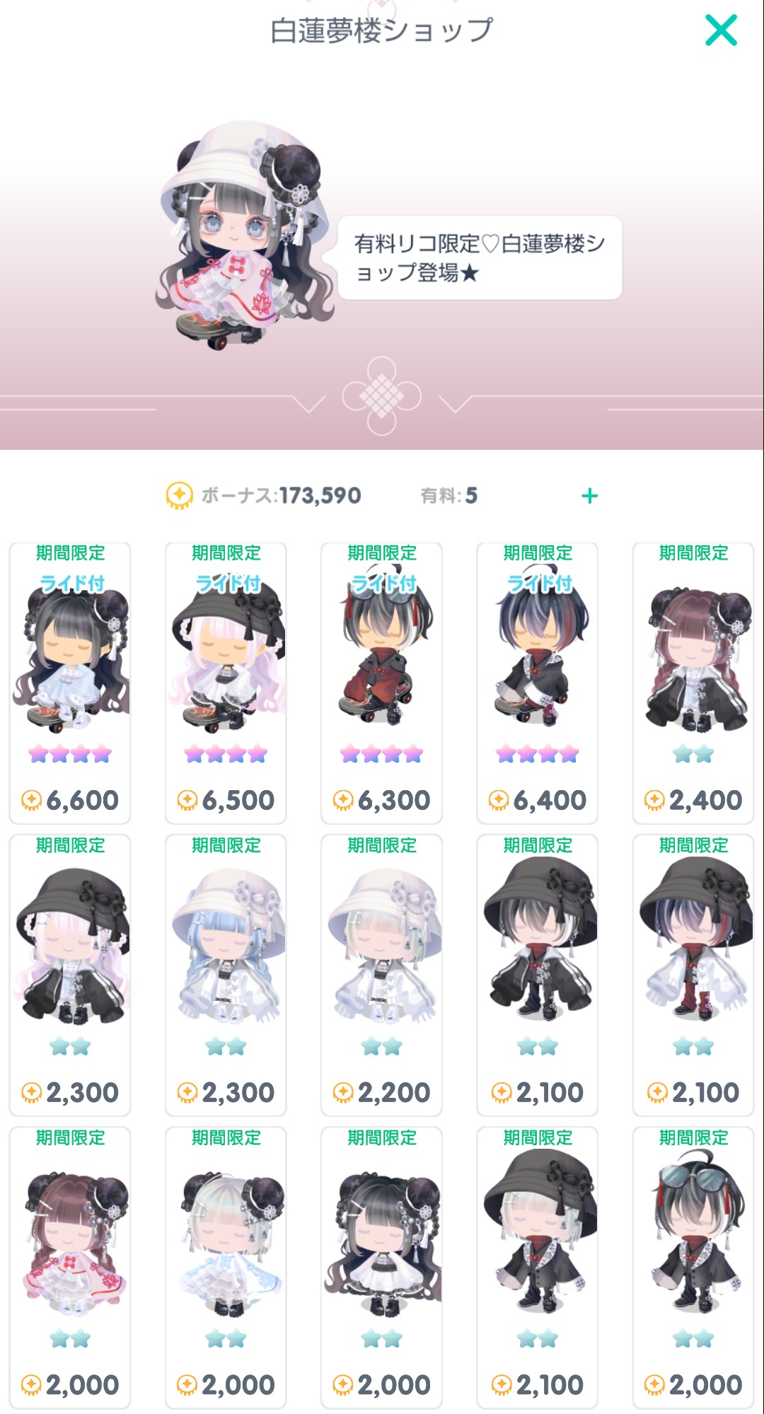 安いコーデは1,400リコ、高いコーデとなるとライド付きで6,600リコと高額仕様となっており