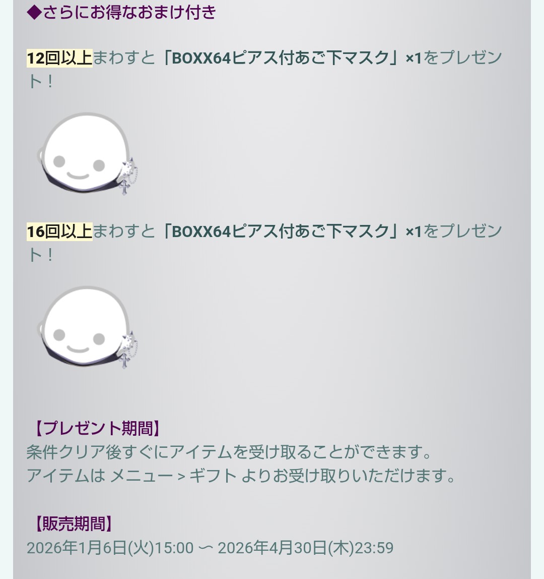 流石にアゴマスクばっかりおまけになってない?w手抜き感パないし、LUNAと対にしてるみたいになってるけどだからといっておまけで搾取を目論んでるのはいかがなもんかと思うんだけどね。おまけならおまけらしくせめて初回の連ガチャで1個は貰えるようにするのがおまけってもんじゃない?