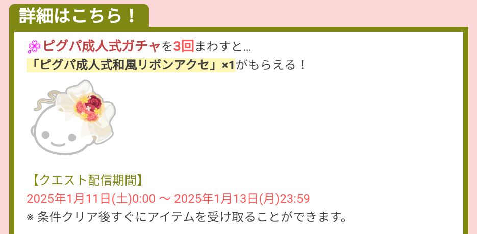 まず最初がコチラのクエストで、下記内容のピグパ成人式ガチャを3回回すことで和風リボンアクセが貰えるっていうことなんだけど~