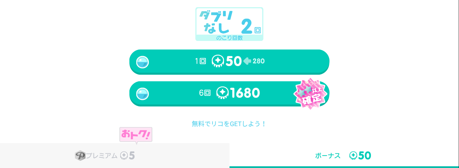 連ガチャを考えている場合は、1回280リコとクオリティのわりに割高価格なのでぶっちゃけおススメはしないってところになりますね( ´_ゝ`)フーン