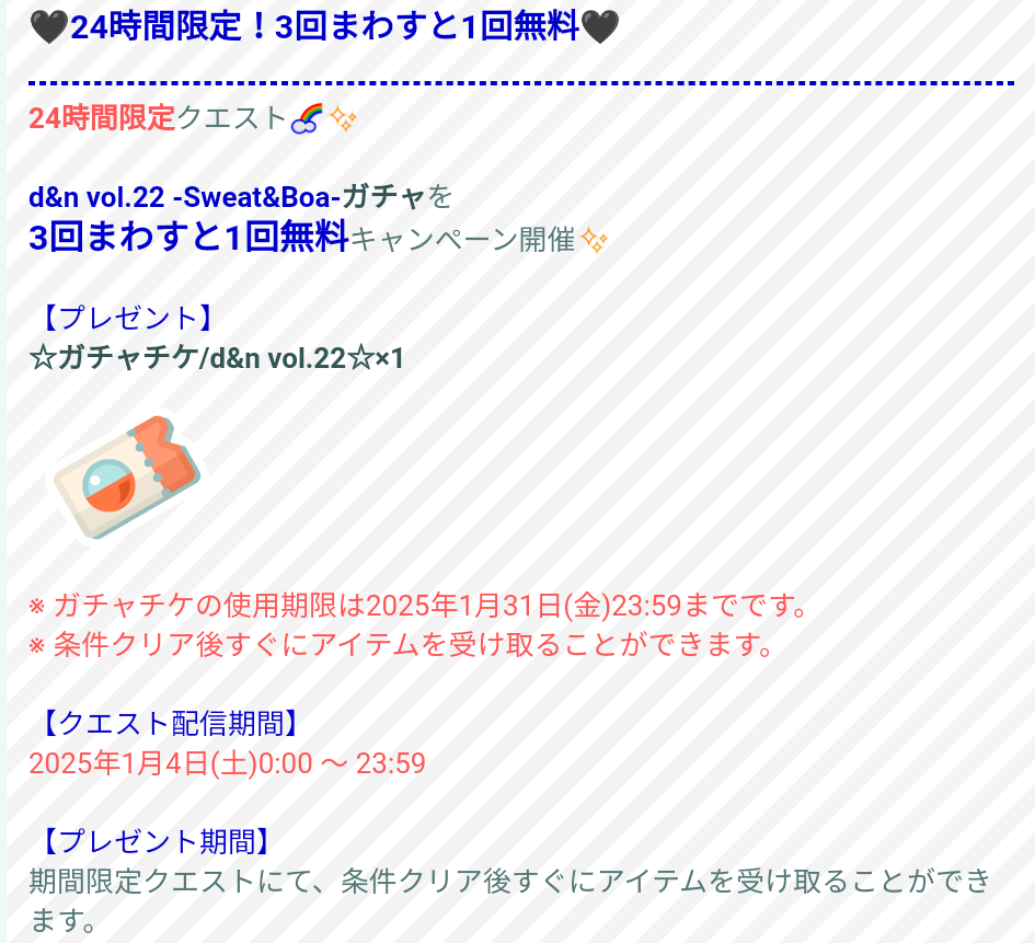 販売開始から24時間限定クエストとしてこちらのガチャを3回回すことで