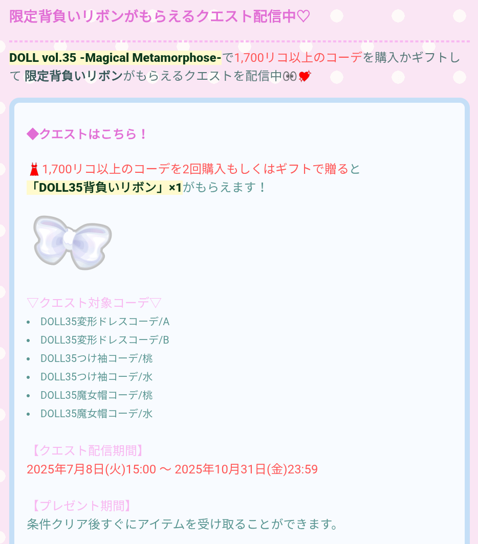 ギフトクエストでは1,700リコ以上のコーデを2回購入することで