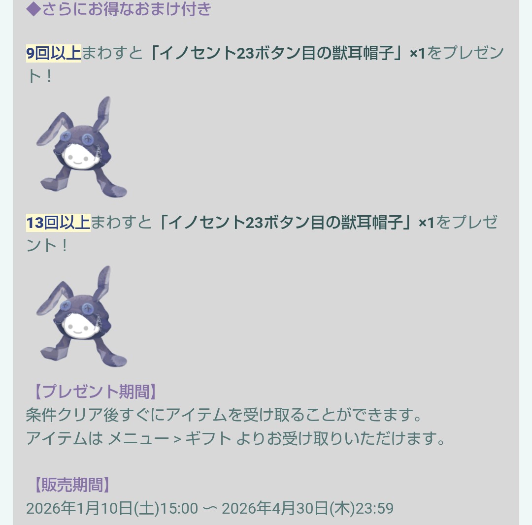 規定回数でにてイノセント仕様のギフトボックス(もようがえアイテム)が複数もらえるそうなのですが、