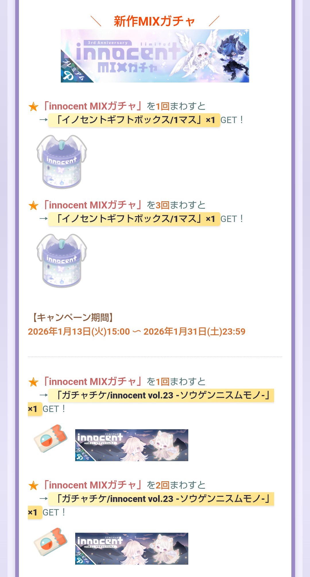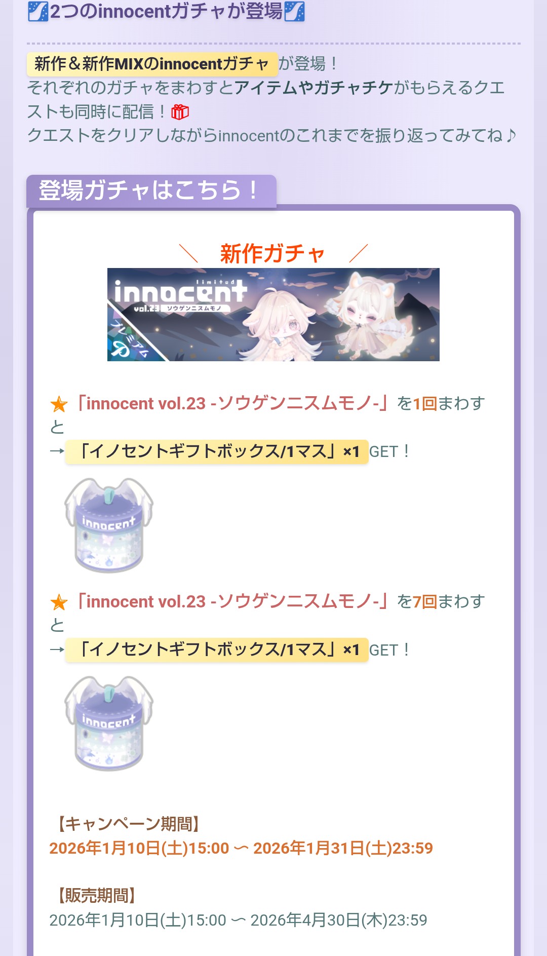 ピグパブランドのイノセントが新作とMIXガチャとイベクエ連動している有料ガチャより