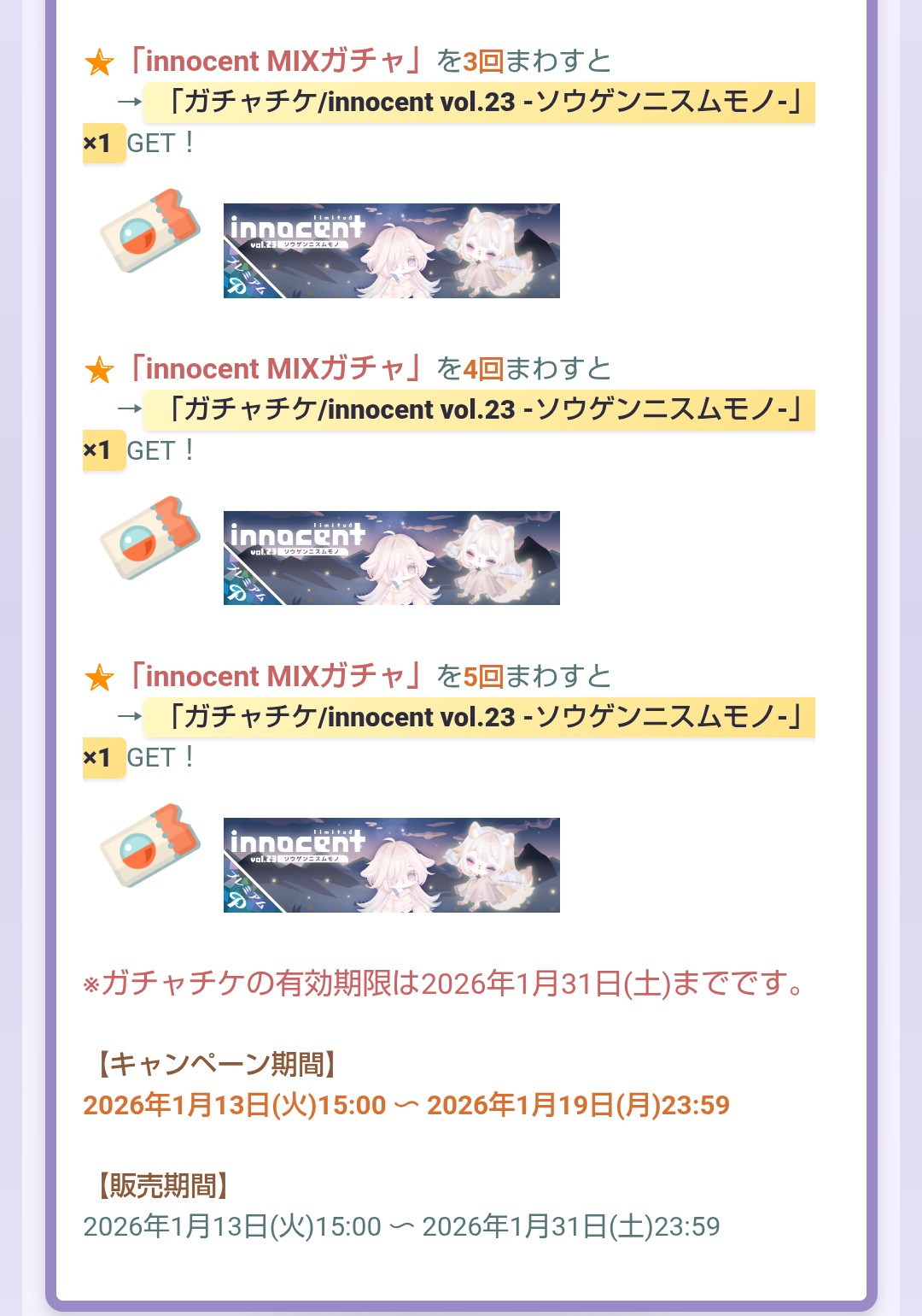 今回のガチャを狙うユーザーはこれから出てくるイノセントMIXガチャを回すことでソウゲンニスムモノのガチャチケが【最大で5枚】もらえる連動クエとなっているからそれを回収してからの方がお得感あると思うよ?(ΦωΦ)シランケドw