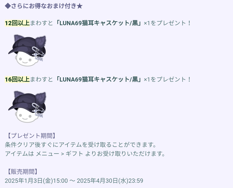 猫耳付きのキャスケットが最大で2個もらえるそうですが~全体内容を見てもらったら解るんですが、
