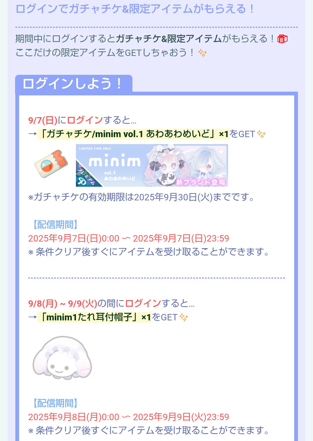 期間内の各日程にて無料リコやminimあわあわめいどガチャ