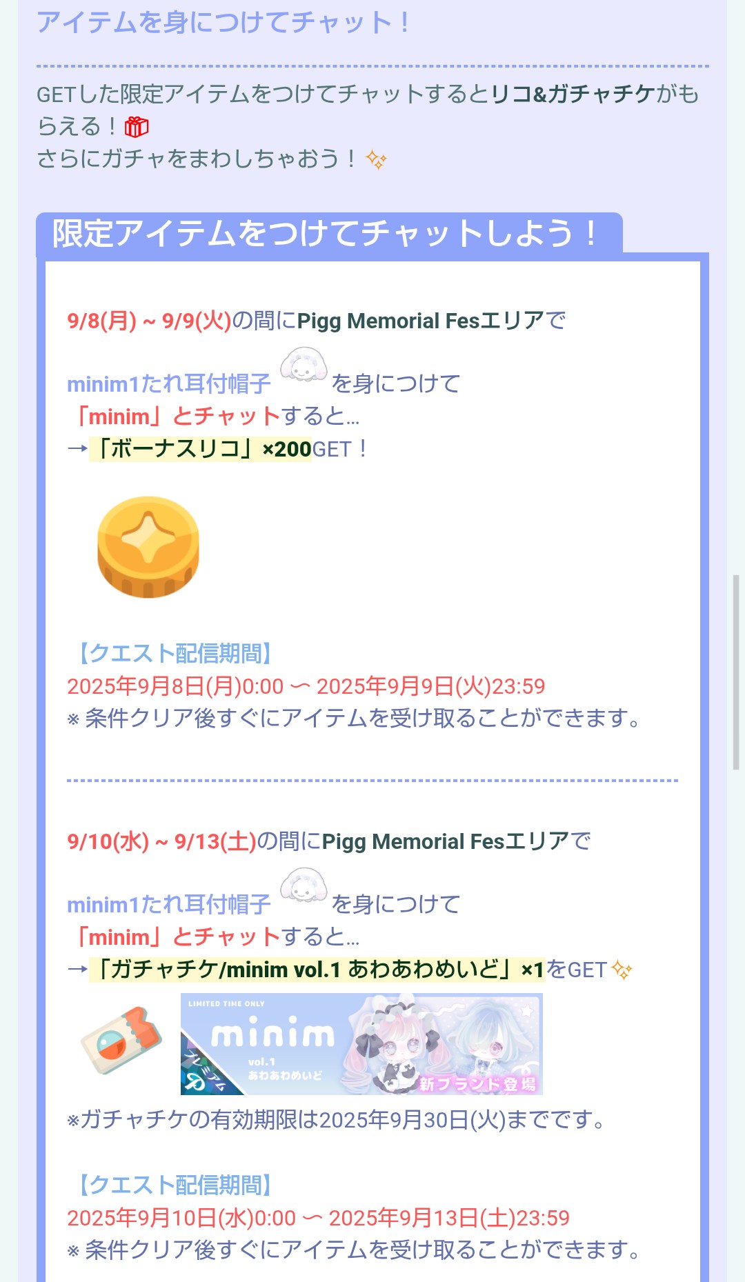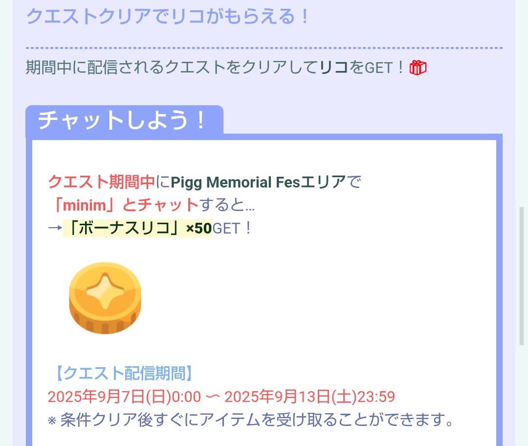 こちらではピグメモリアルフェスエリアにて『minim』とチャットするこで50リコが貰えます。