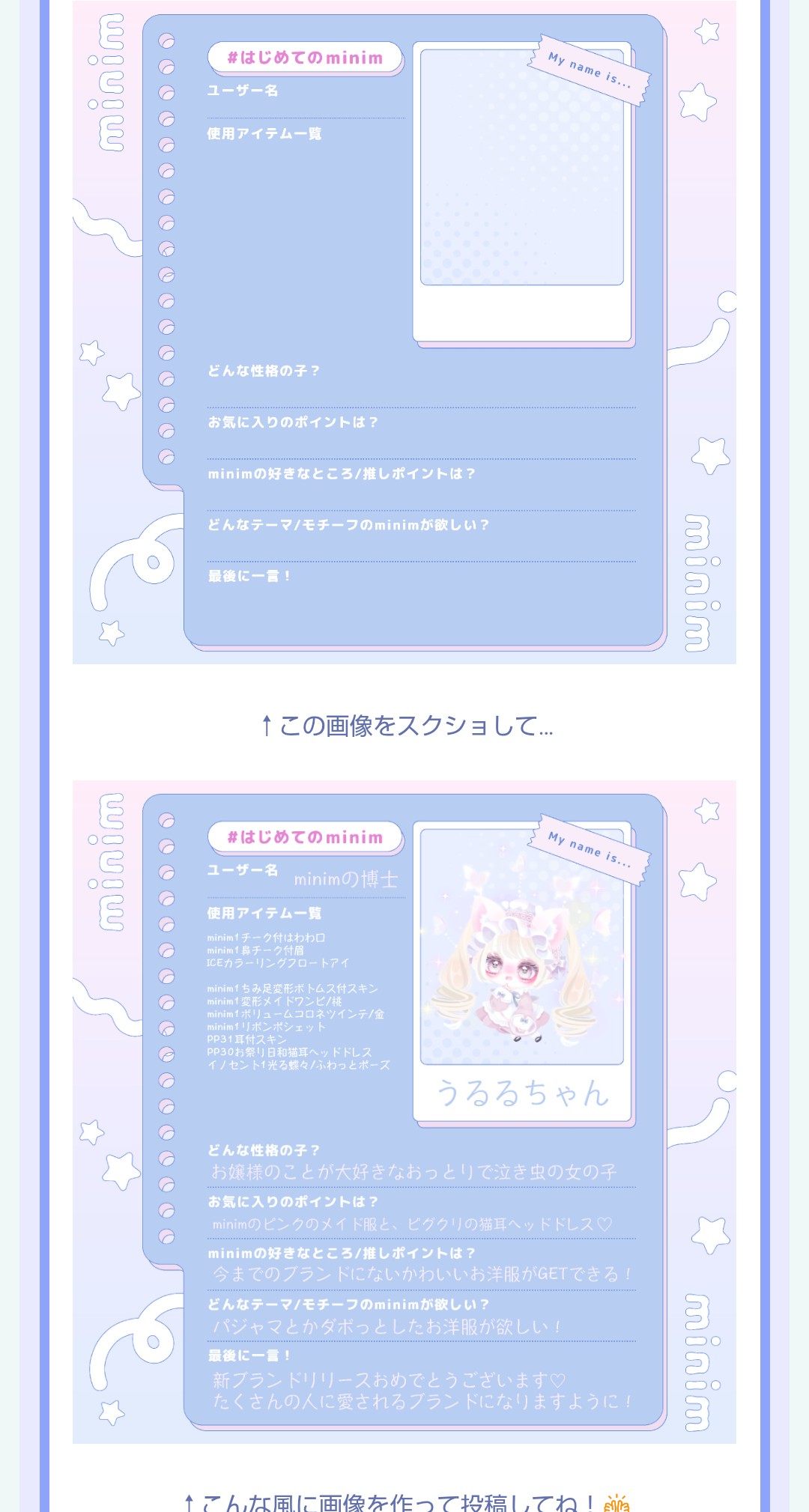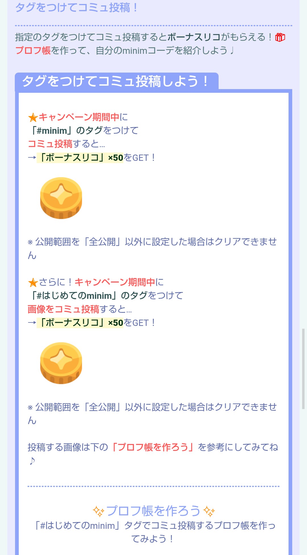 ラストではコミュにて、ハッシュタグ【#minim】や【#はじめてのminim】