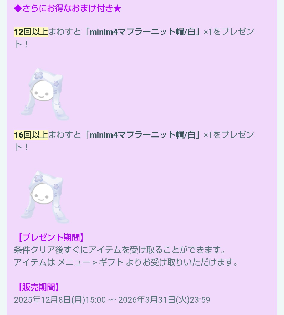 12回(連ガチャは8連のため)+16回にてマフラーニット帽の