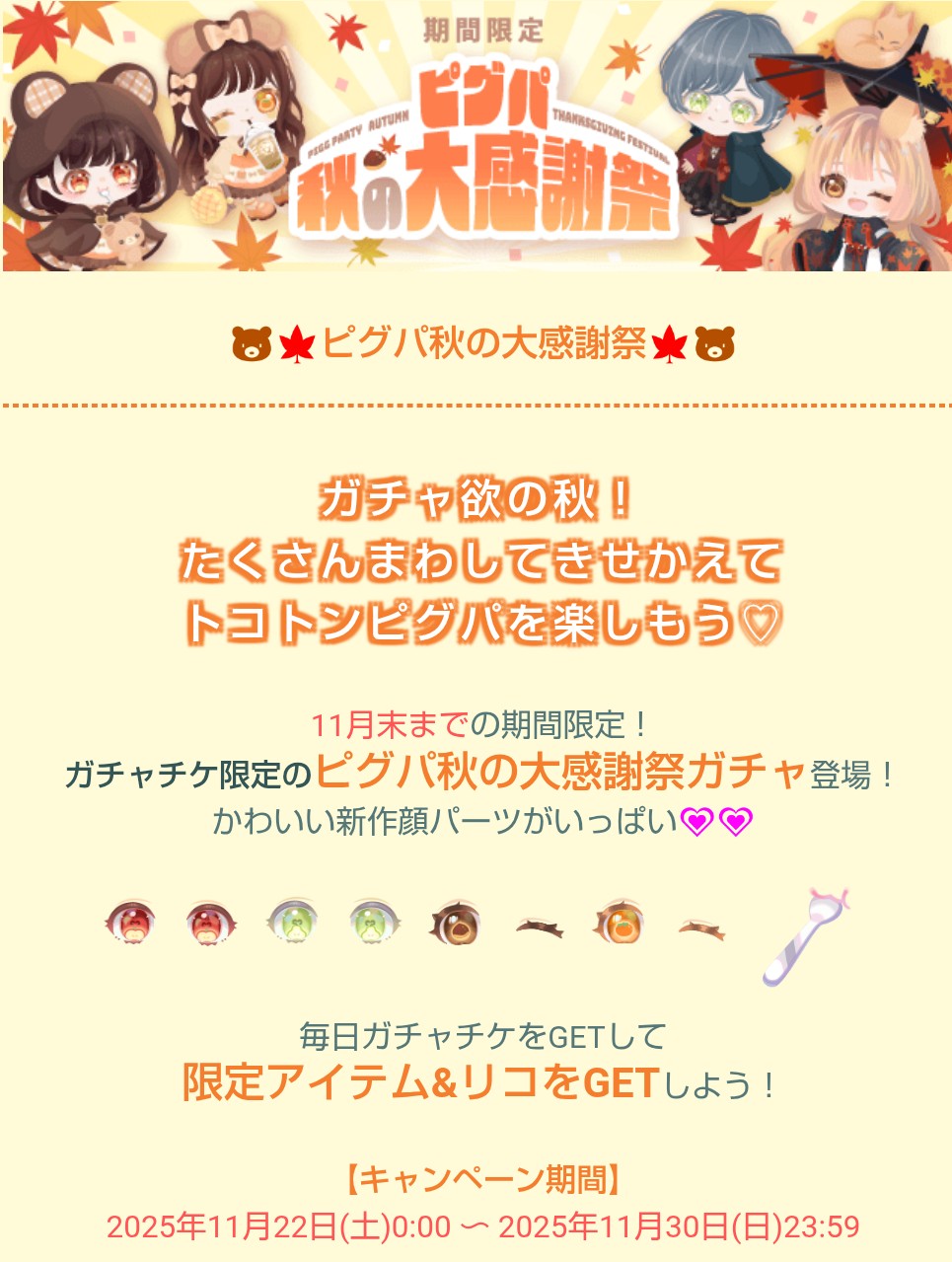 ピグパ秋の大感謝祭 クオリティが普段の無料内容と変わらないのにこれで大感謝祭?舐めとんかw(#゚Д゚)ゴルァ!! 公開日:2025年11月22日 イベントクエストガチャネタ こちらでは貰えるものが全然感謝が詰まっていない低クオリティ内容なイベントクエストより 「ピグパ秋の大感謝祭」が登場したので記録していきますね(`◉◞౪◟◉) 続きを読む