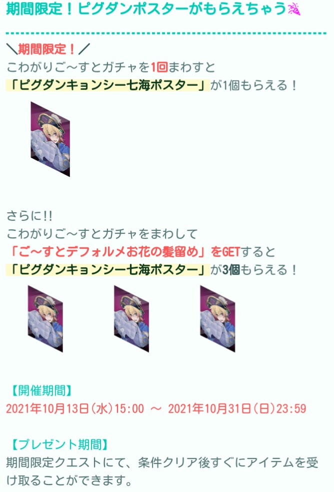 何故かこのこわがりごーすとガチャに無理やり便乗してポスターをま配っているキャンペーンをやってますがぶっちゃけピグダンと普段の有料内容の棲み分けやってるので良い物を無理やりぶっ込まれても喜べるのはピグダン好きの信者くらいだろwww