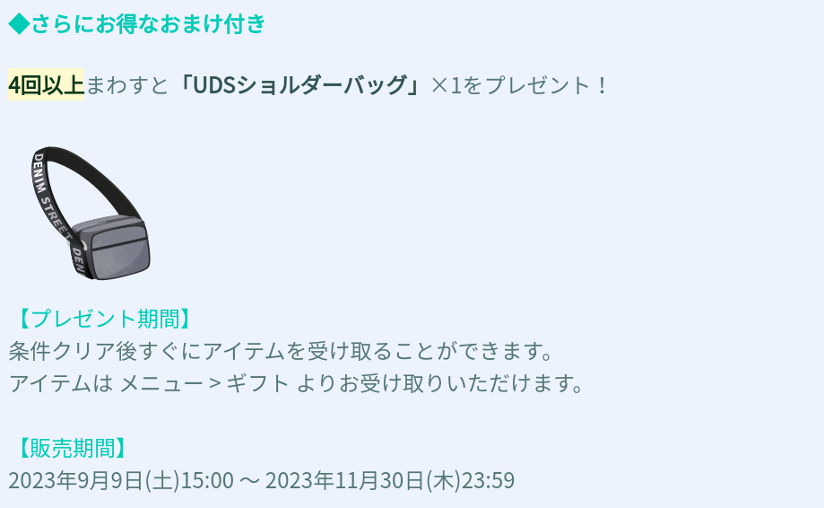おまけ内容では有料も無料も初回の連ガチャで貰う事の出来る4回という設定には〇だと思えるんだけどぶっちゃけ内容がショボくてロゴ入りのショルダーバッグは使いにくいのが残念だと思いました( ゚д゚)タシカニ
